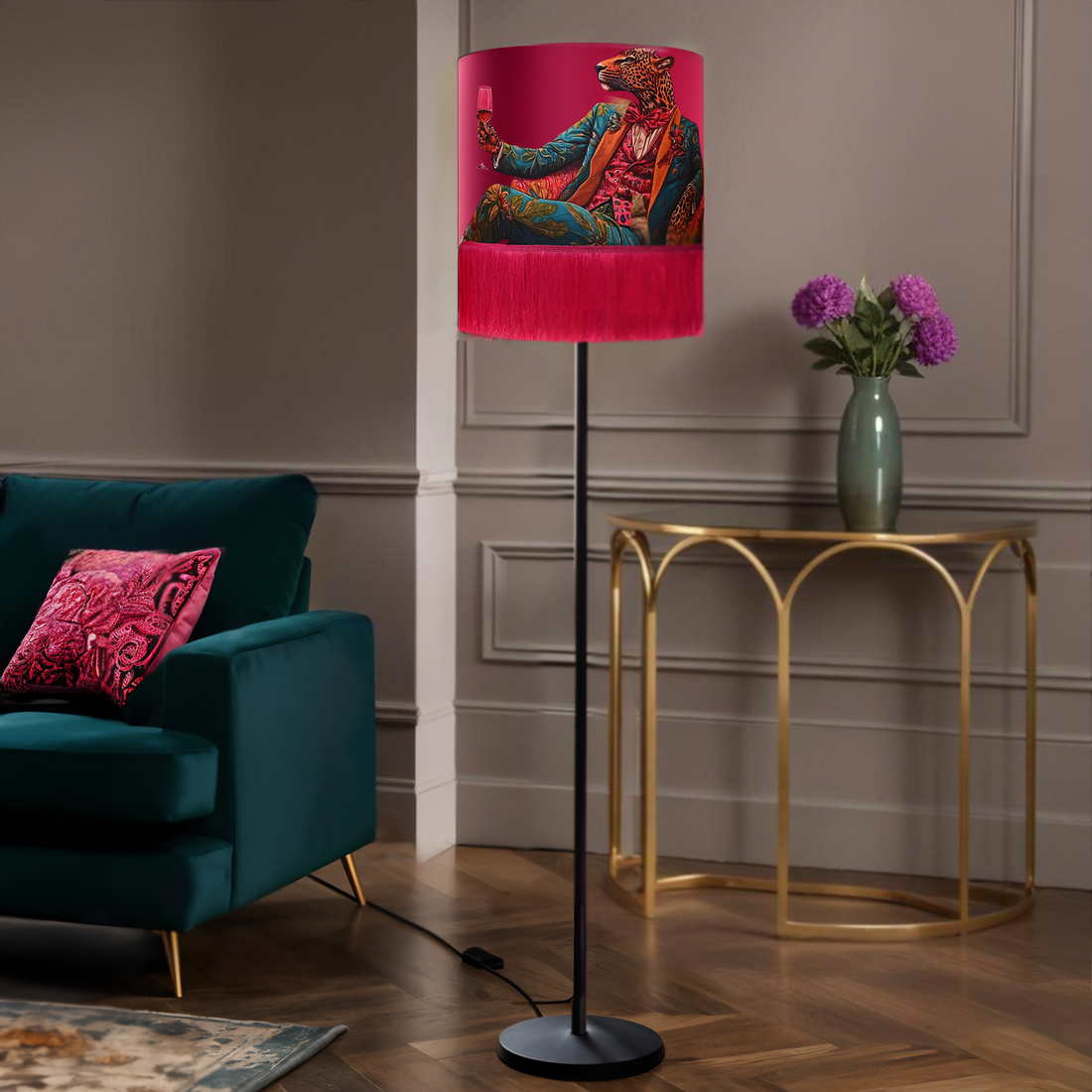 Gulaabi Sip - Sleek metal stand lamp crowned with a quirky pink pop Indian lampshade.
