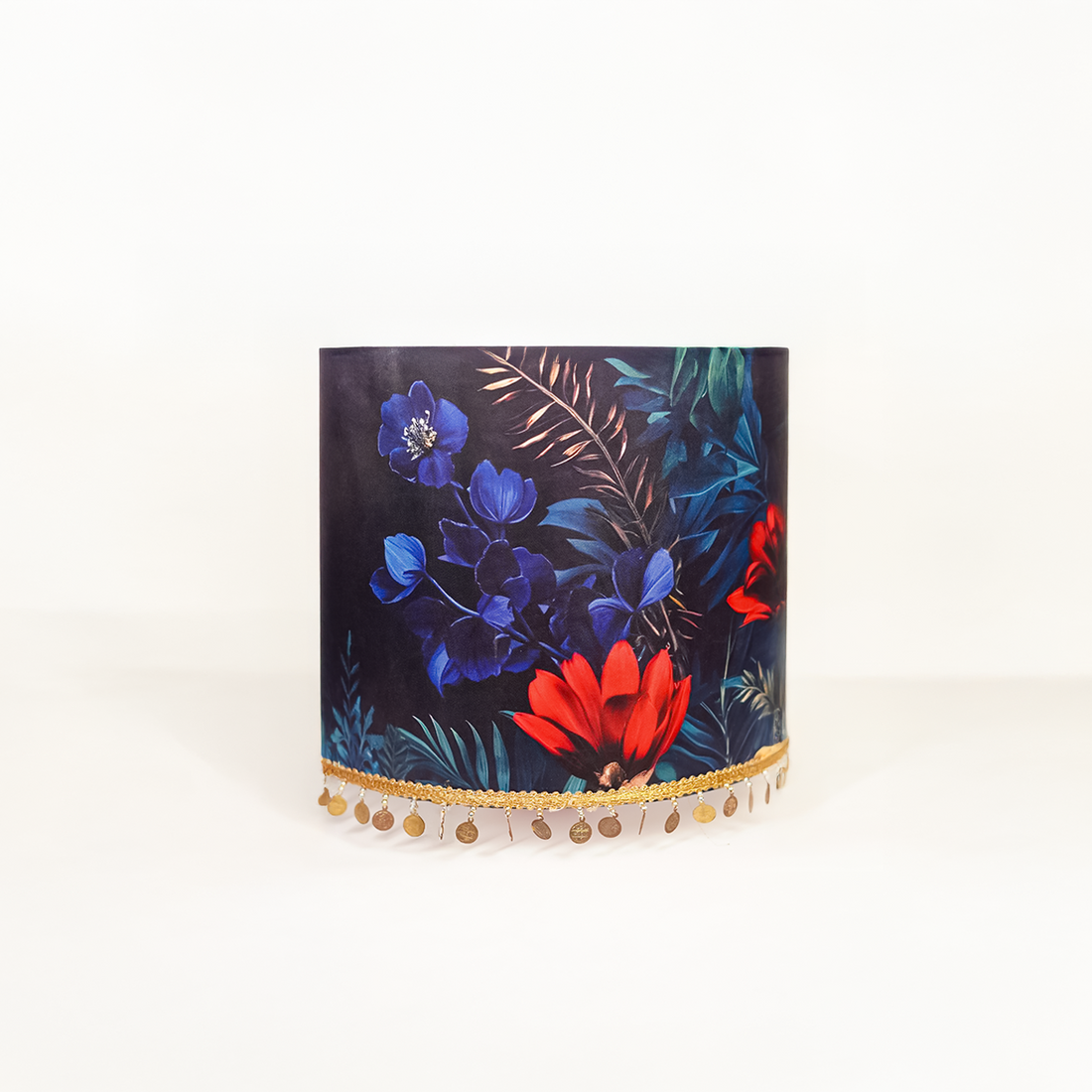Material: Fabric lampshade with wooden/metallic standColor: Midnight navy background with bright floral reds, oranges, and...