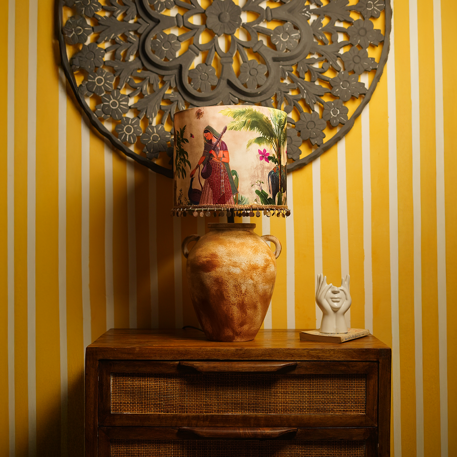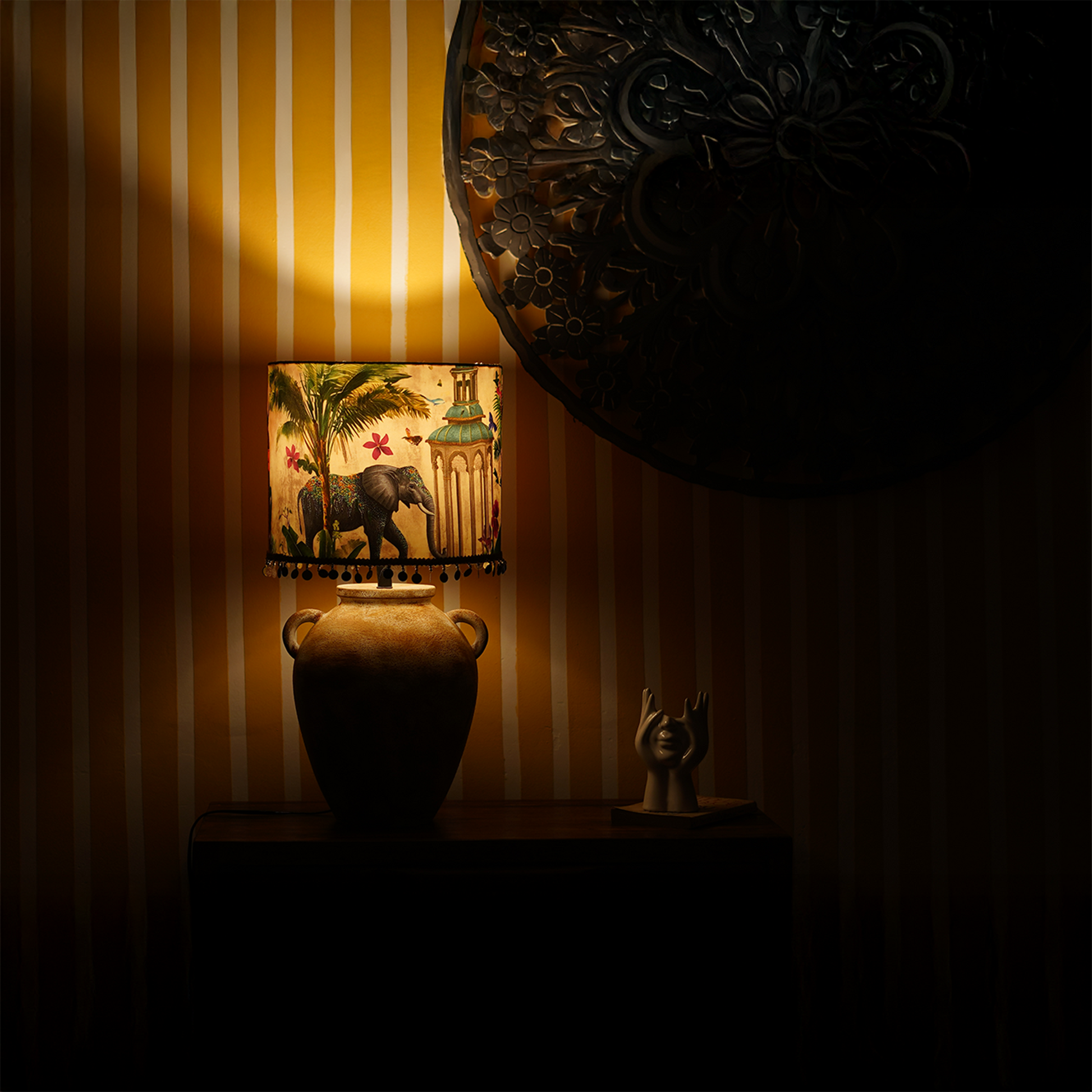 A hand-painted terracotta base in earthy ochre tones, paired with a fabric shade featuring an illustrated elephant, palm trees, and floral accents. Finished with delicate golden tassel trim, this lamp blends artisanal charm with a touch of whimsy.