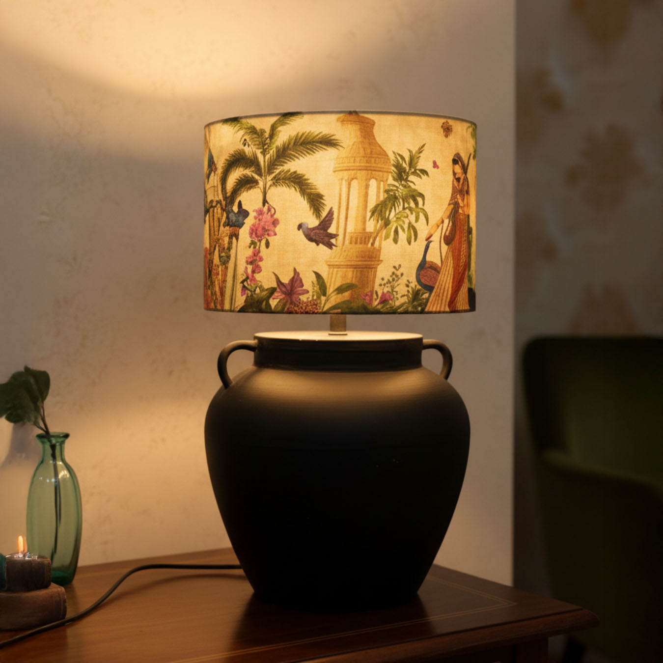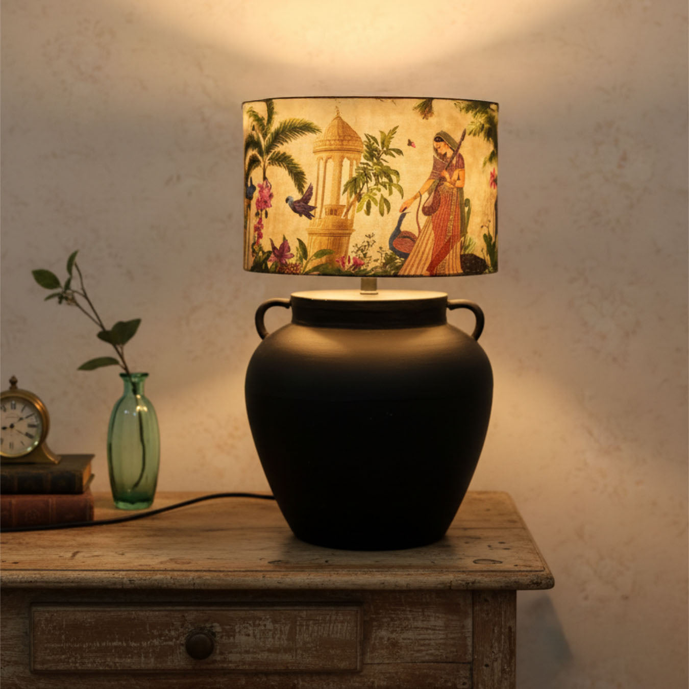 Radiating an old-world charm, Noor Mahal is a tale of timeless Indian elegance. Its artful shade paints a serene courtyard scene — royal arches, peacocks, and a graceful lady surrounded by nature’s calm. The deep black urn base anchors the piece with quiet strength, making it a perfect blend of tradition and sophistication. A lamp that doesn’t just light up your room — it lights up nostalgia.